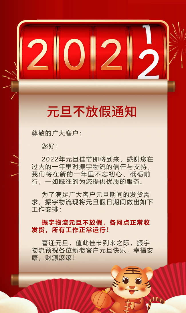 2022年元旦佳節(jié)即將到來,感謝您在過去的一年里對振宇物流的信任與支持,我們將在新的一年里不忘初心、砥礪前行,一如既往的為您提供優(yōu)質(zhì)的服務(wù)。