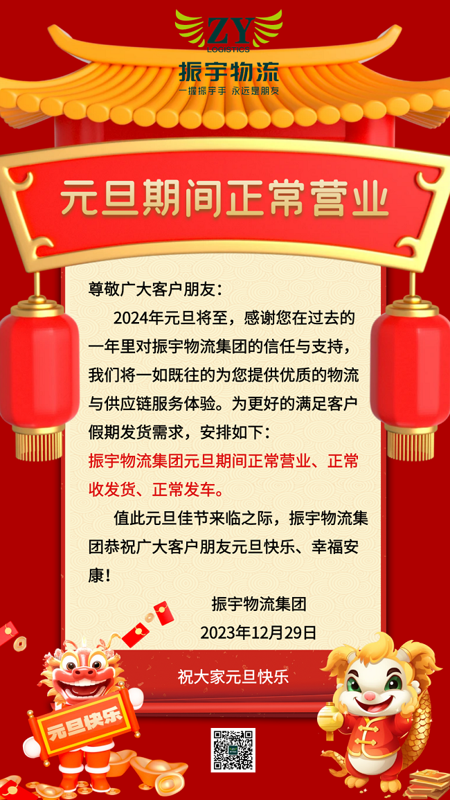 2024年元旦將至,感謝您在過去的一年里對振宇物流集團的信任與支持,我們將一如既往的為您提供優(yōu)質(zhì)的物流與供應(yīng)鏈服務(wù)體驗。為更好的滿足客戶假期發(fā)貨需求,安排如下: