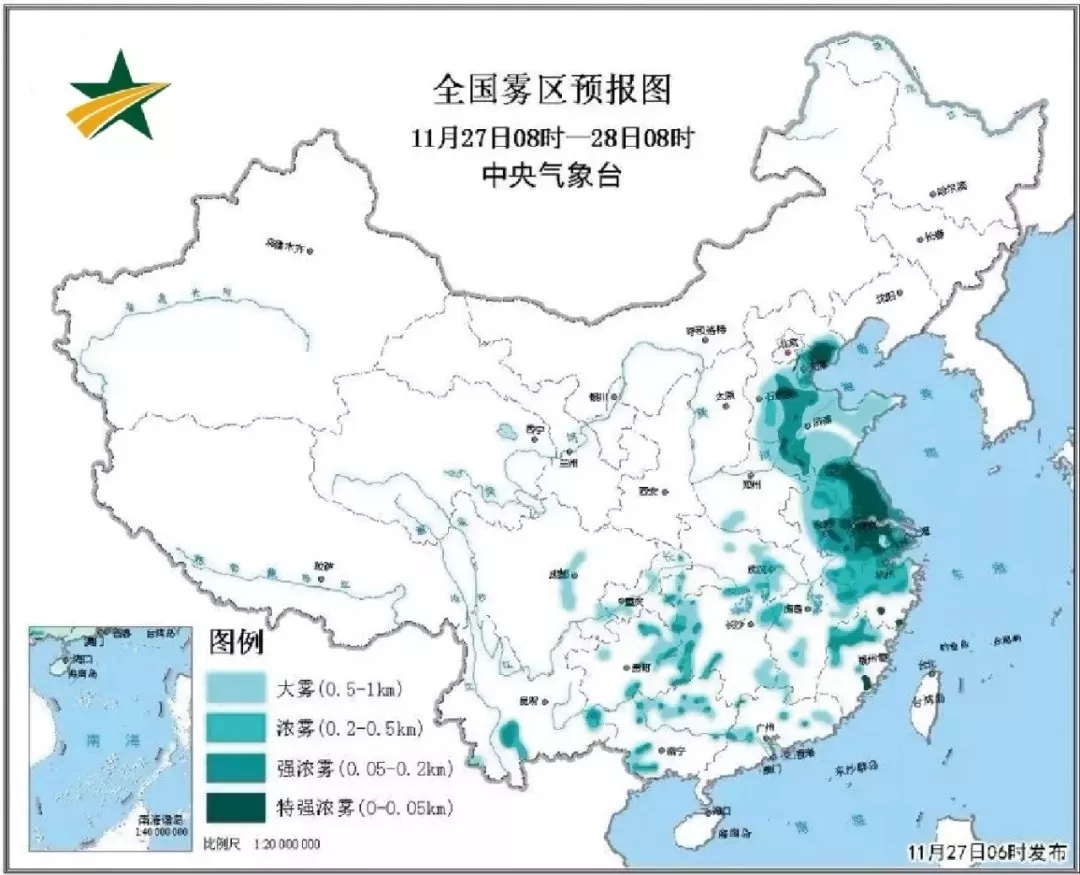 中央氣象臺11月27日06時繼續(xù)發(fā)布大霧橙色預(yù)警,27日早晨至28日早晨,華北中東部、黃淮東部和南部、江淮、江漢平原的部分地區(qū)將有大霧,其中河北東部、山東西南部、安徽東部、江蘇、上海、浙江北部等地有濃霧或強濃霧,局地有能見度不足50米的特強濃霧。預(yù)計華東地區(qū)的大霧天氣會一直持續(xù)到12月2日,長達一周。
