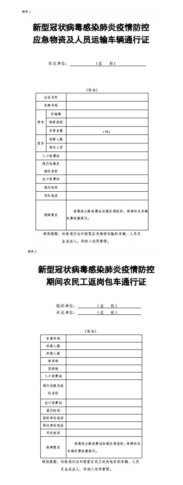 通知要求,地方各級交通運(yùn)輸部門要認(rèn)真落實(shí)《交通運(yùn)輸部關(guān)于切實(shí)保障疫情防控應(yīng)急物資運(yùn)輸車輛順暢通行的緊急通知》和《交通運(yùn)輸部關(guān)于疫情防控期間免收農(nóng)民工返崗包車公路通行費(fèi)的通知》要求,切實(shí)簡化“新型冠狀病毒感染肺炎疫情防控應(yīng)急物資及人員運(yùn)輸車輛通行證”(簡稱“車輛通行證”)、“新型冠狀病毒感染肺炎疫情防控期間農(nóng)民工返崗包車通行證”(簡稱“包車通行證”)辦理流程,通過政府網(wǎng)站、微信、電子郵件等便捷方式提供“車輛通行證”“包車通行證”統(tǒng)一式樣,供承運(yùn)單位或駕駛?cè)嗽诒镜刈孕写蛴?、自行填寫?/span>
