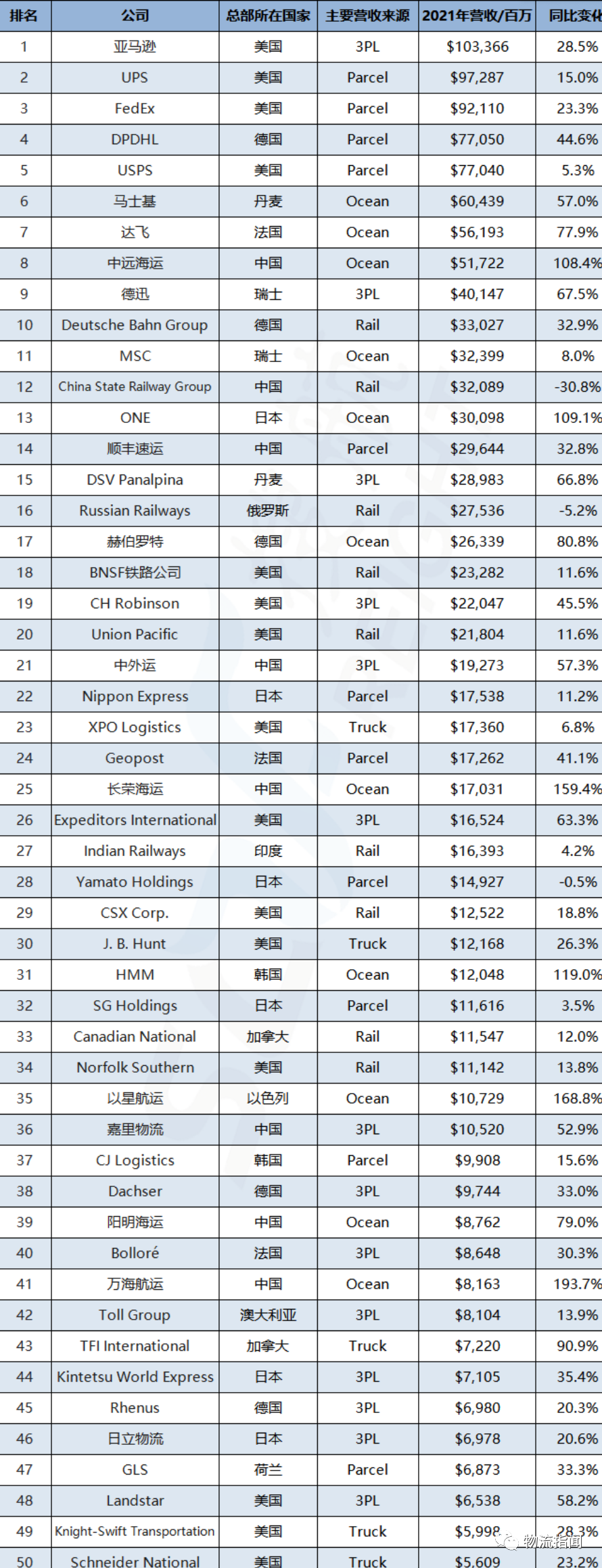 據(jù)了解,全球50大運(yùn)輸供應(yīng)商2021年的總收入達(dá)到了1.29萬億美元,同比增長31.4%,創(chuàng)歷史新高。50家企業(yè)中有47家實(shí)現(xiàn)了年度增長。