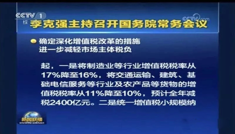 會議指出,過去五年通過實施營改增累計減稅2.1萬億元。按照黨中央、國務(wù)院部署,為進一步完善稅制,支持制造業(yè)、小微企業(yè)等實體經(jīng)濟發(fā)展,持續(xù)為市場主體減負(fù),會議決定,從2018年5月1日起,一是將制造業(yè)等行業(yè)增值稅稅率從17%降至16%,將交通運輸、建筑、基礎(chǔ)電信服務(wù)等行業(yè)及農(nóng)產(chǎn)品等貨物的增值稅稅率從11%降至10%,預(yù)計全年可減稅2400億元。