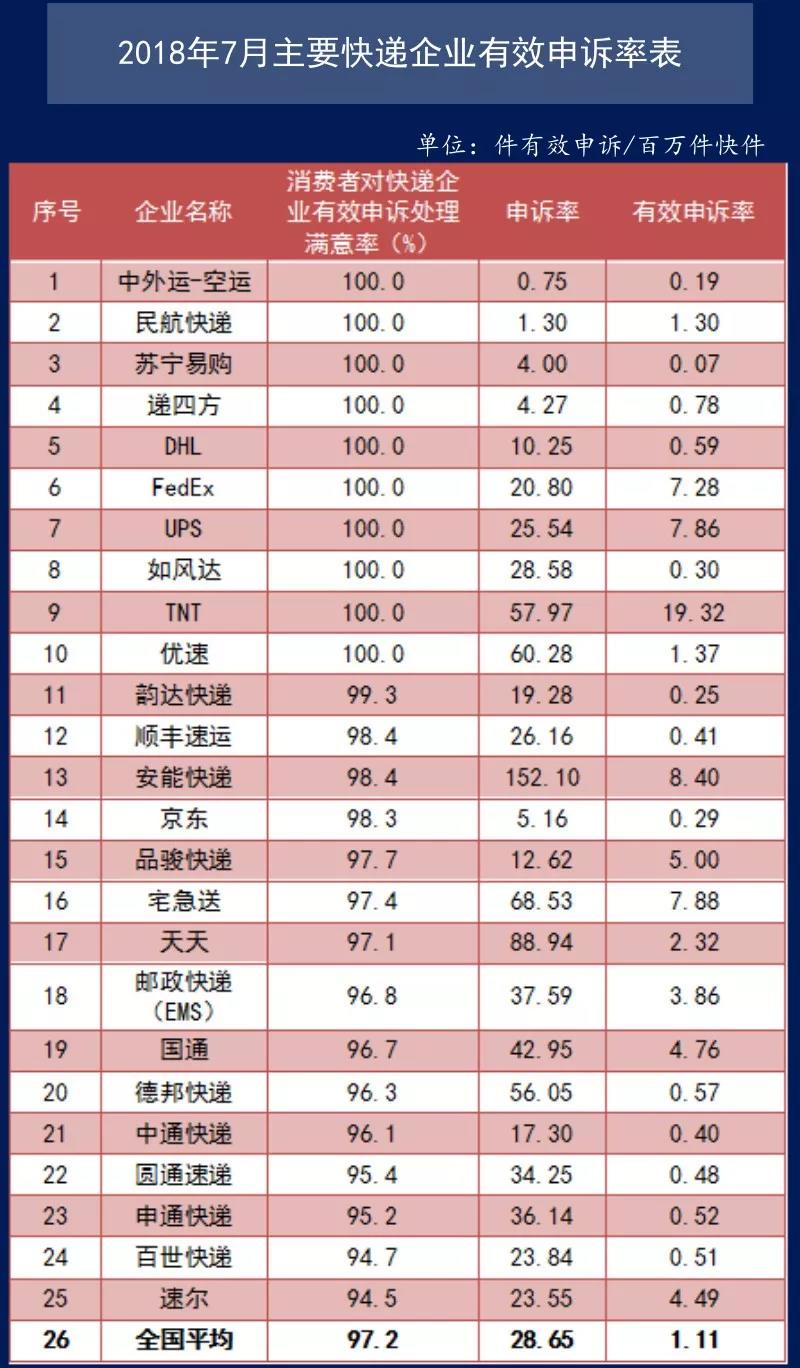 7月,消費(fèi)者對(duì)快遞企業(yè)有效申訴處理滿意率(消費(fèi)者對(duì)快遞企業(yè)有效申訴處理滿意件數(shù)與快遞企業(yè)有效申訴總量之比)為97.2%,低于全國平均有效申訴處理滿意率的快遞企業(yè)有9家。