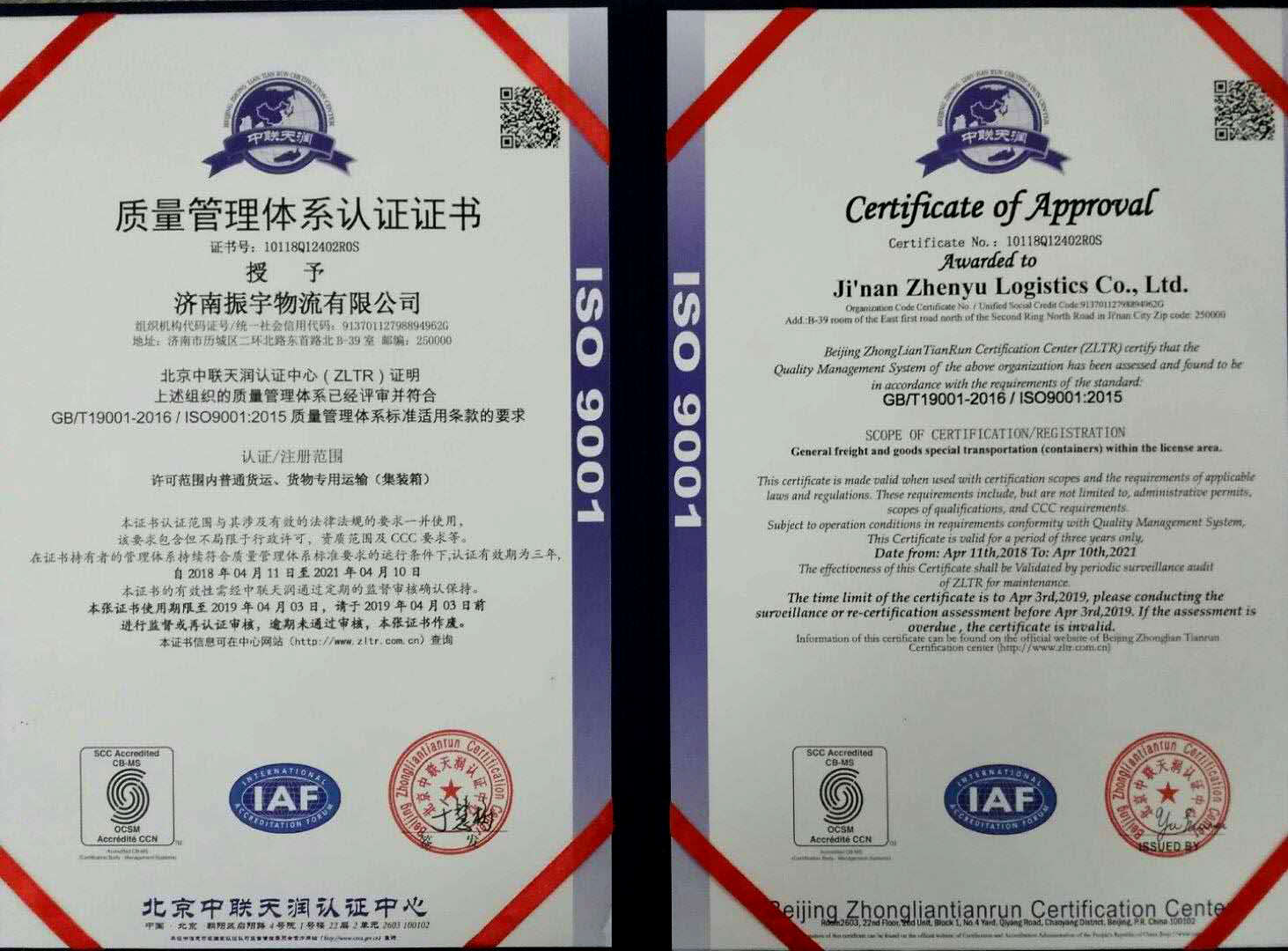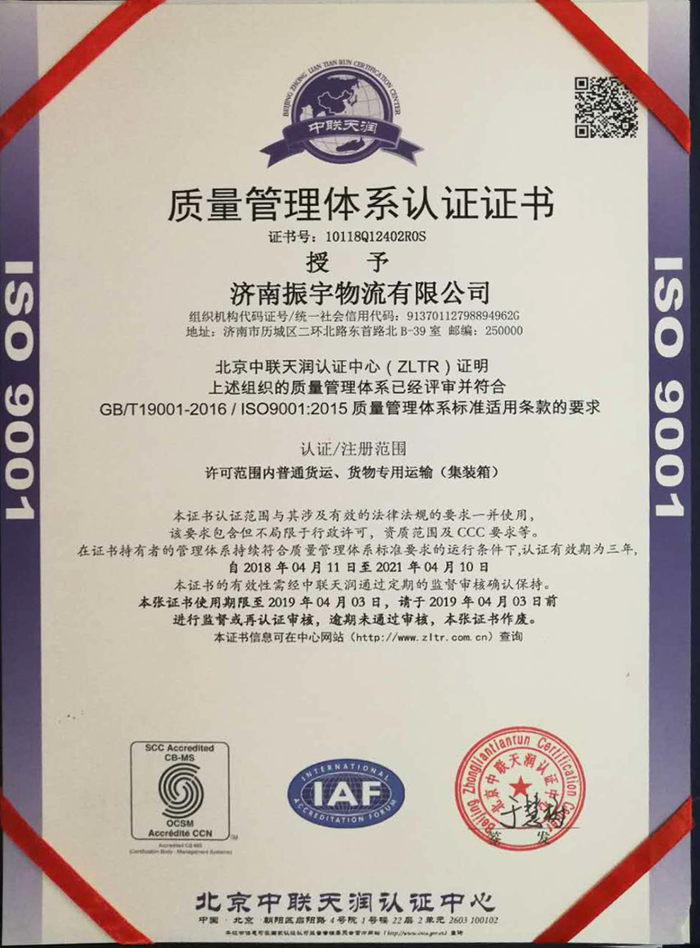 ISO 9001質(zhì)量管理體系認證證書
